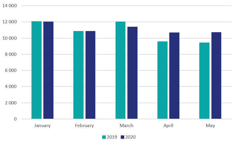 The graph compares registration numbers for the period 1 January through 31 May in 2019 and 2020 respectively.